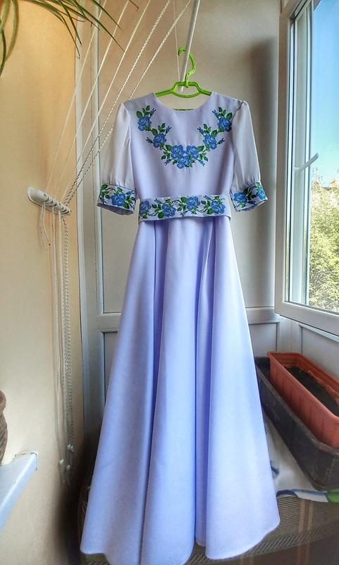 Продається вишите плаття для дівчинки. Купляли на перше причастя. Одягалося один раз. Тканина габардин, машинна вишивка На ріст 145 буде по підлогу Пів обхват талії- 34 см Довжина рукава-27 см Від талії до низу -83 см Горловина 15,5 см