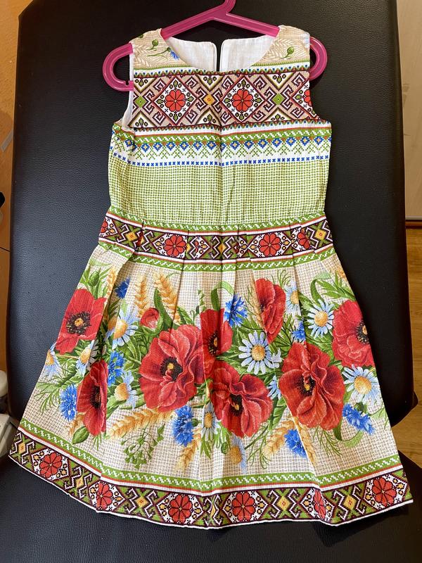 Нарядное вышитое платье с пышной юбкой, имеет сзади замочек. Новое без бирки.Плечи 26см Длина 64 см Пояс 31 см Длина замка 32 см