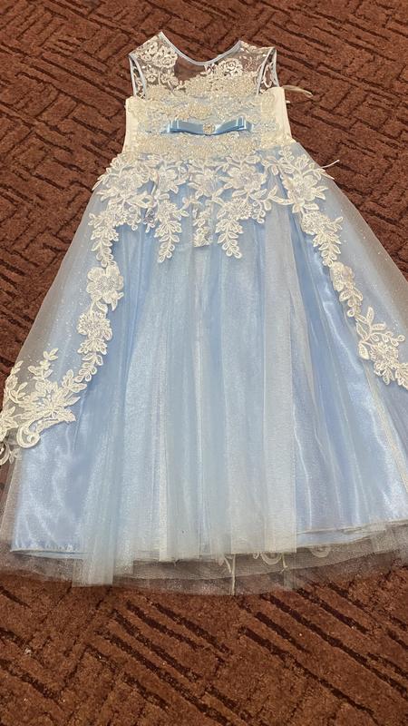 Очень красивое платье со шлейфом. В более идеальном состоянии. В подарок идут перчатки голубого цвета. Бусины все на месте. Сзади регулируется за счет корсета..