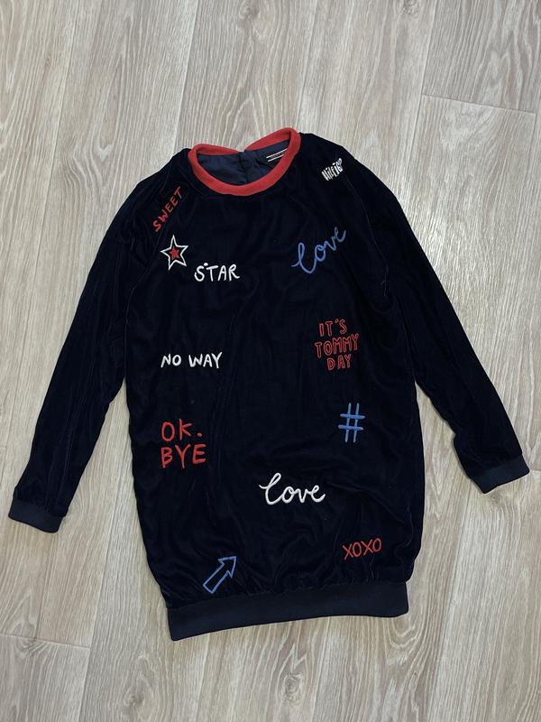 Бархатное платье темно-синего цвета. Надписи вышивка Полиестер Платье новое, одето пару раз. 🏷Tommy Hilfiger 140 р Длина 72. ПОГ 44. Рукав от шеи 60