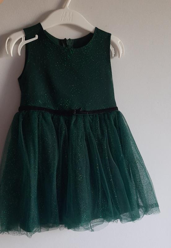 Блестящее зеленое платье с молнией сшито по заказу для девочки 1-2 года. Внизу зеленая костюмная ткань, сверху 3 слои фатина (средний с блестками) украшена черным блестящим поясом с бантиком. Одетая 1 раз. Замеры: От плеча до низа - 45 см Обхват груди - 45 см Обхват талии - 48см