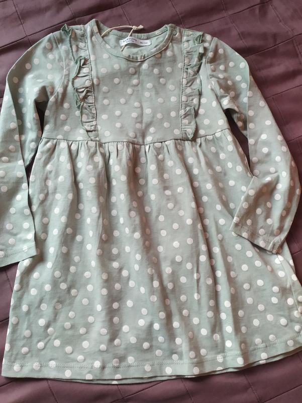 Красивое платье от известного бренда. Совершенно новая, бирку ребенка оторвала, но осталась веревка от бирки. Купили, но так и не успели поносить, переросли. Платье нежно зеленого цвета, фото не передает. Замеры: Длина 49, ширина под рукавами 29, плечи 24.5, рукав 35