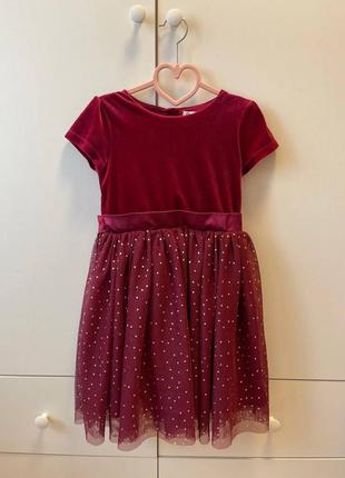 Платье цвета марсала. Верх : материал велюр, низ : подюбник атласный и 2 слоя фатина с блестками. Имеет пояс из атласа. На спине застегивается на пуговицы. Состояние: идеальный Размер : от 5 до 7 лет на бірці зріст 116