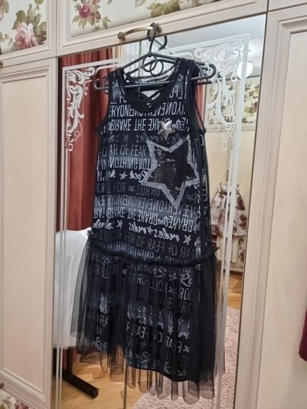 Платье-двойка итальянского бренда Sarabanda на 12 лет, рост 152 Нижнее платье хлопковый трикотаж, верх - платье из сетки Замеры полуобъемов: подмышкой - 40 см талия - 42 см пр плечах - 29 см Длина платья - 90/94 см