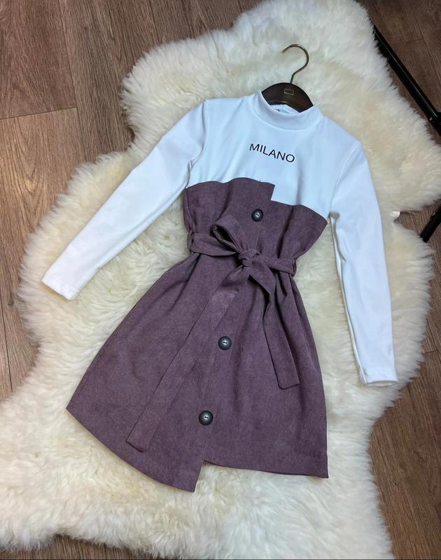 Стильное и теплое платье для девочки. Верх - термо-трикотаж. Низ - микросвободвет. Прикрашено декоративними гудзиками. Пояс в комплекті. Замеры: 140 - длина - 69см, полуобхват груди - 37см, рукав -45см. Мс