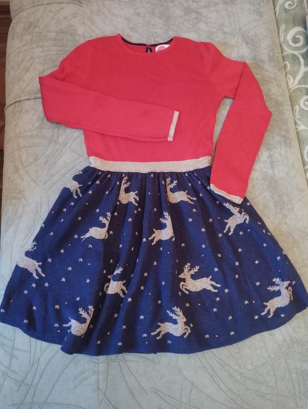 трикотажное платье. Очень красивая, верх насыщен красный, пояс золотой - мерцает за счет люрексной нити, а юбка словно звездное небо (теж мерцает),с очаровательными оленями. Состояние новой вещи, без следов носки.