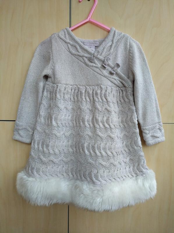 Шикарное красивое теплое платье с блестящей нитью и меховой отделкой по низу. По бирке на 12 мес, а по факту 1,5-2 года( на рост 86-92). Ориентируйтесь по замерам. Пог 27. Рукав от плеча 30. Длина 45. Стан идеален!