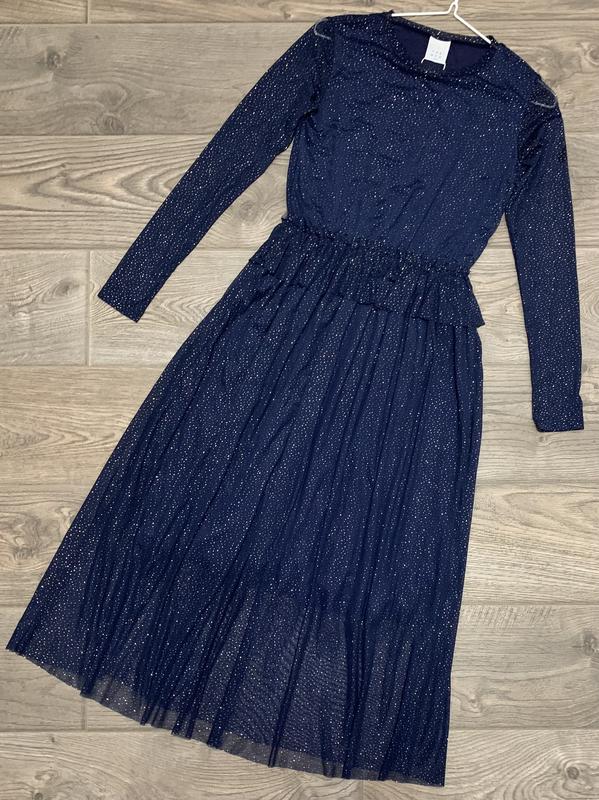 Вишукана сукня датського преміум-бренду The New р. 13/14 років (158-164 см). На підкладці, верхній шар сукні - сіточка. В наявності - у синьому кольорі. ПОГ 43 см + тягнеться ПОТ 32 см + тягнеться (резиночка) ПОБ- вільна спідниця Рукав 60 см Довжина 121 см