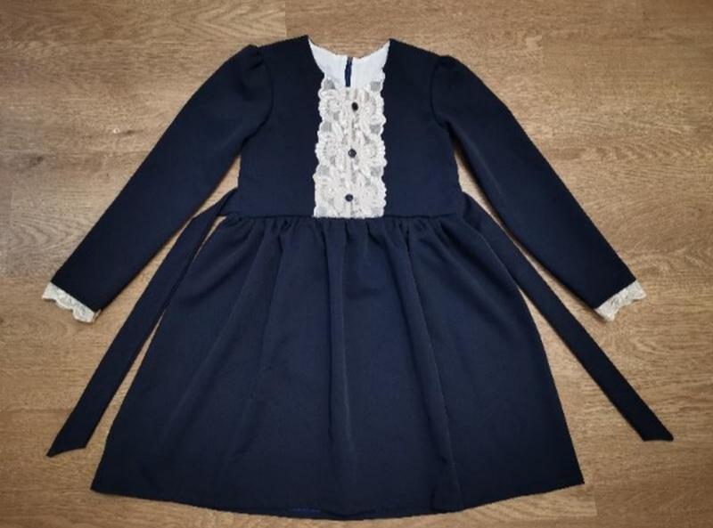 Новое школьное платье Размер 128- 134 Натуральный качественный материал Темно-синий цвет, почти черный Шито на заказ Длина по спинке от плечей 73.5 см, от пояса до низа 43 см Плечи 30 см, ширина под руками 35 см, ширина в поясе 35 см (сзади затягивается) Длина рукава от плечей 49.5 см (без белого манжета 47 см)