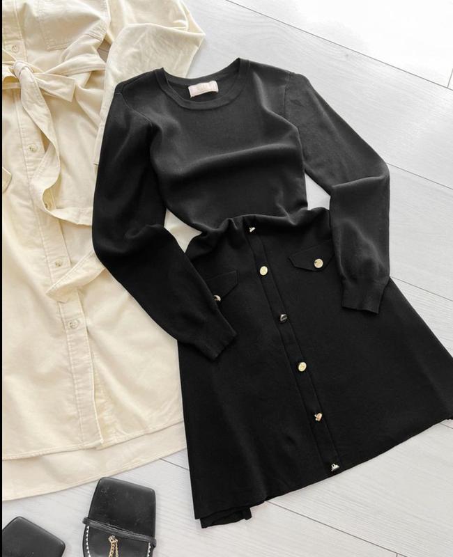 черное платье в рубчик с золотыми пуговицами на наборе подростковый размер 9-10 лет %вискоза,35%полиамид полуобхват: грудь-35см(тянется до 45см) талия-29см(потянется до 38см) бедра-45см(потянется до 53см) рукав-50см длина платья-75см