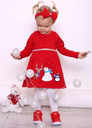 Дуже красива та яскрава новорічна сукня для маленьких принцес від 1,5 до 4 років. Відшита з тепленького трикотажного полотна (рібана з начісом), тому вашій дівчинці в ній буде комфортно та затишно. В комплект входить еластична пов’язка на голову з бантом, прикрашеним фатіном. Сукня вільного крою, довжиною до коліна, з завищеною лінією талії. На спинці застібається на 4 кнопочки. Спереду сукня прикрашена аплікацією із 4-х кумедних зимових персонажів, нашитих на сукню за допомогою машинної вишивки. На талії плаття прикрашене нашитою срібною стрічкою, яка також використовувалася для декора пов’язки. Склад: 95% БАВОВНА, 5% ЛАЙКРА. Полотно добре тримає форму, не сідає та не деформується. Рекомендуємо прати вручну або в пральній машині при делікатному режимі і макс. температурі 30°С. Не відбілювати. Прасувати при макс. температурі 110°С.