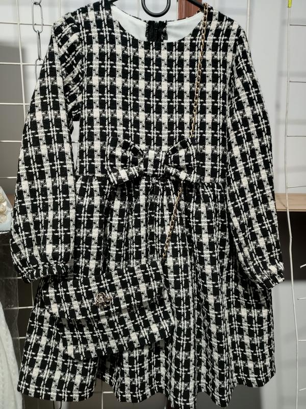 Тепленькое платье "твед" с сумочкой, имеет в наличии в размере 116,122,128. При необходимости выполните дополнительные замеры и фото.