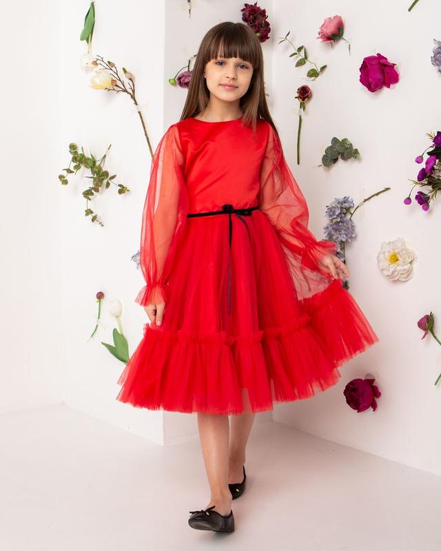 Святкова сукня Тканина - королівський атлас, євросєтка По спинці застібається на блискавку. Рукав короткий по лікоть. довж/пог/пояс 116/70/32/28 122 /71/ 33/31 128/75/34-/32 134 78/36/33 140/84/39/34 146/87/41/36 +-2см