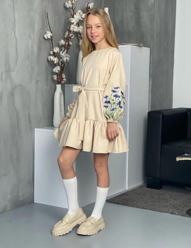 арт 4021 Невероятно красивое и нежное платье На рукавах настоящая вышивка Поясок в комплекте Можно носить с поясом и без Тканина костюмний креп рост/пог/рукав/длина похибка+-2см 128/38/50/68-1шт 140/40/51/71-1шт Тан