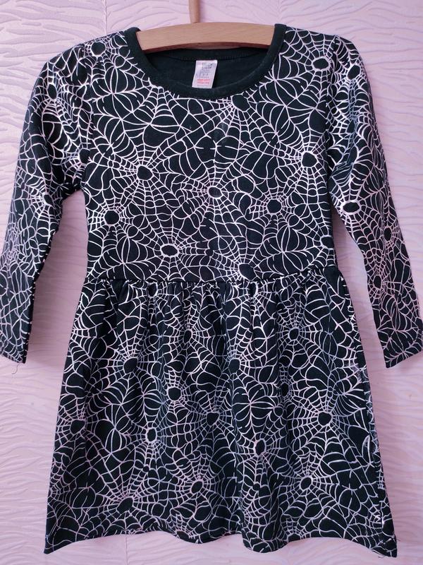 Очень симпатичное трикотажное платье с принтом "паутинка". Приятное к телу, паутина не белая, а серебристого цвета с блеском (металлик). Длина платья 51 см, по груди 29, талия 25, низ 43, рукав 33см. Арт. 0243.