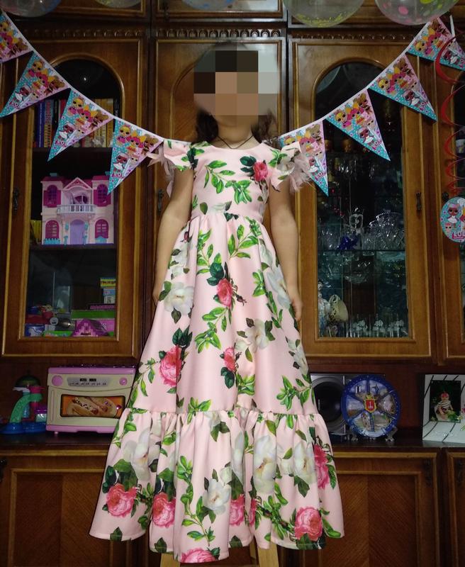 Ніжна сукня для дівчинки. ніжно персиково - рожевого кольору в квіточки Стан ідеальний. На рукавах з пір'ячком яке дуже легке в догляді. Ззаду замочок і корсет. Довжина сукні 105см ПОГ З4см ПОТ (не затягнутий корсет) 33см