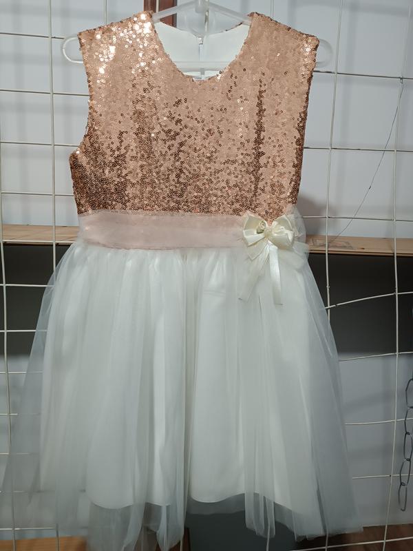 Милое платье для девочки, верх- пайетки, низ фатин. Имею в наличии в размере 128. олагаю, что она маломерит. При необходимости выполните дополнительные замеры и фото.
