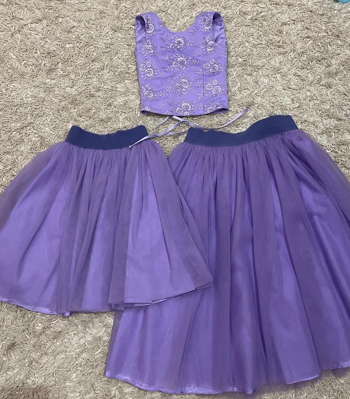 Комплект мама -дочка, для мами спідничка розмір S-M гарно тягнеться, для дочки 7-9 , можно носити з топіком ( сзаді регулюється корсетом) , або під любу футболку. Чудово можно поєднати як з туфлями так і кросівками. Одягали 1 раз мама, 2 раза дочка . Заміри скину