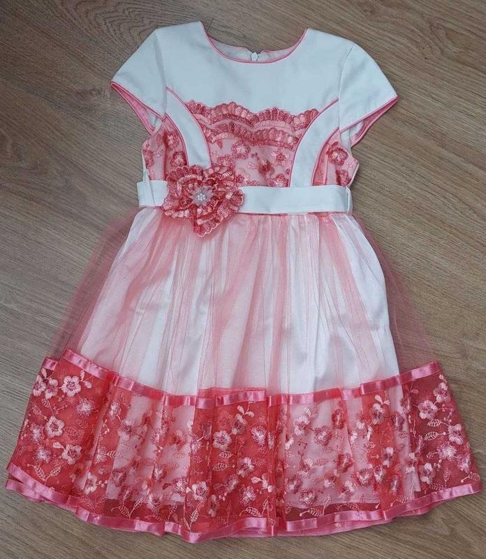 Платье для девочки Размер - 104 и 110 Ткань: атлас, подкладка - х/б. Цвет: молочный, фатин - коралловый. Верх платья отделан гаптировкой (вышивкой), низ - фатином и шитьем, края обработаны коралловым кантом. Платье украшено поясом с цветком. Сзади на молнии.