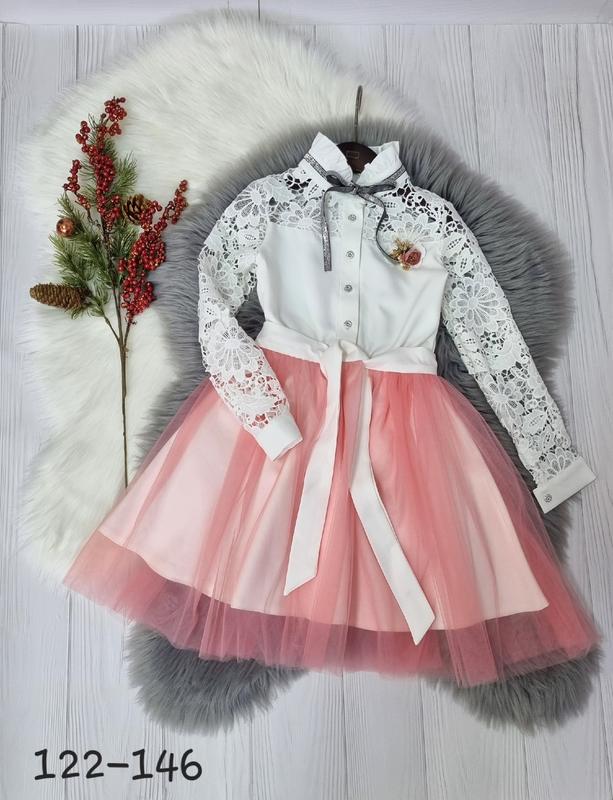 💞В НАЯВНОСТІ Нежное платье с фатиновой юбкой на завязках тканина костюмка, фатиновая юбочка и брошка снимаются на рукавах есть манжеты, застегиваются на пуговицы Рекомендую!!! 122(4 шт)-длина 65,пог 32,рукав 46, длина юбочки 47 128(4 шт)-длина 67,пог 33,рукав 47,длина юбочки 48 134(4 шт)-длина 70,пог 34,рукав 48, длина юбочки 50 140(3 шт)-длина 74,пог 36,рукав 49, длина юбочки 52 146(3 шт)-длина 75, пог 38,рукав 53, длина юбочки 54 +-2 см Цена 870 грн