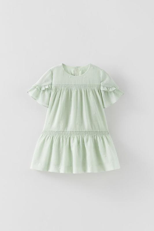 ПЛАТЬЕ С ВЫШИВКОЙ ПЛЮМЕТИ Платье из рельефной ткани. Круглый вырез, короткие рукава. Каплевидный вырез на спине с застежкой-пуговицей. Вышивка плюмети. ЦВЕТ МОРСКОЙ ВОЛНЫ | 1088/345