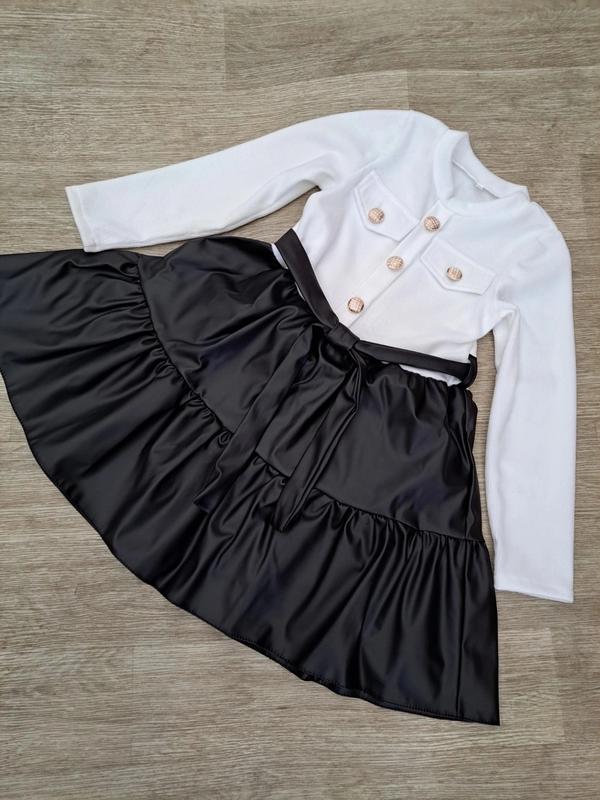 Стильное теплое платье для красавиц 💗 Ткань трикотаж вафелька на легком утепленном, + экокожа Завязывается под поясок, отделка пуговицы Замеры: длина/пог/рукав от плеча 128 - 66/34/49 134 - 70/34/52 140 - 71/35/54 146 - 74/36/56 128 - 1 134 - 1 140 - 2 146 - 2 Арт саш