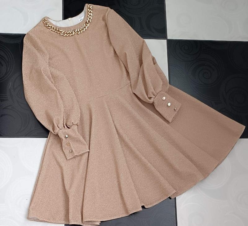 Стильное платье для девушек. Украшено цепочкой, пояс в комплекте. Ткань - люрекс, приятная к телу. Замеры: 152 длина - 80см, полуобхват груди - 41см, рукав от плеча - 52см. 158 длина - 83см, полуобхват груди - 42см, рукав от плеча - 54см. 164 длина - 87см, полуобхват груди - 42см, рукав от плеча - 56см. Мс