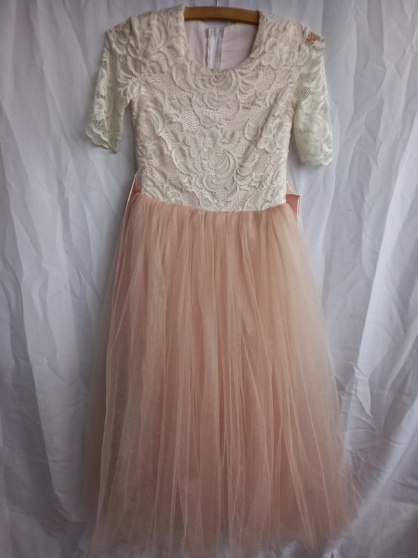 Очень красивого цвета пыльной розы.Верх ажур,низ фатин в два слоя,подклад плотный шёлк,очень красивое! Плечи 32 см,ог 36 см,талия 34(может уменьшаться поясом,который пришит по бокам)см,рукав 24 см,длина 115 см