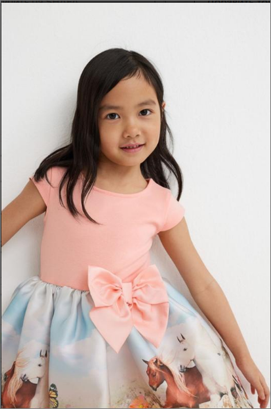 Платье с лифом из мягкого трикотажа. Видимая молния сзади, рукава-крылышки и шов на талии с прикрепленным бантом. Расклешенная юбка на подкладке из блестящей ткани с набивным рисунком