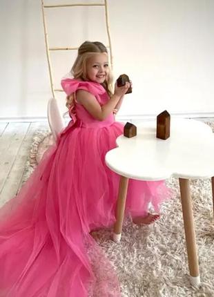 Детское розовое нарядное платье Очень красивое платье в стиле Барби Barbie для девочки от 1до 10 лет. Шлейф сьемный. В наличии идет в стандартном размере: обхват талии 64см, длина спереди 75см. На спинке шнуровка, что дает возможность регулировать корсет. мод.950вес