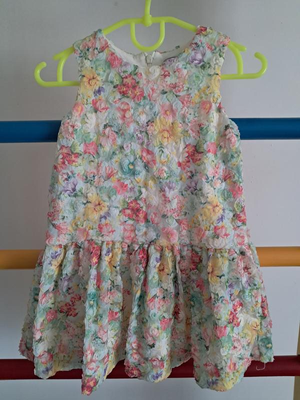 Платье для девочки в разноцветных цветах на нежно зеленом фоне. Цветы нашиты на ткани. Длина платья 50 см, объем груди 52 см.
