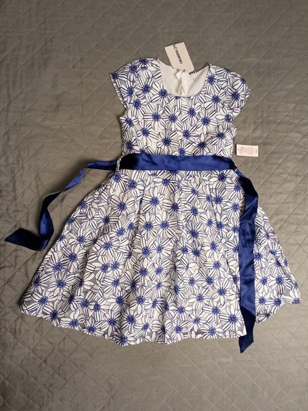Новое платье (с бирками). Красивый узор с синими цветами на белом фоне. Имеет котоновую подкладку. Атласный пояс-лента снимается, его можно завязывать бантом как сзади, так и спереди. На девочку 7-8 лет, указан на этикетке размер 122-128 см. Длина от плеча до подола платья - 69 см Длина от плеча до пояса - 29 см Пояс - 30 см Подмышками - 32 см Длина ленты - 128 см Если необходимы еще какие-то замеры, напишу в частные уведомления.