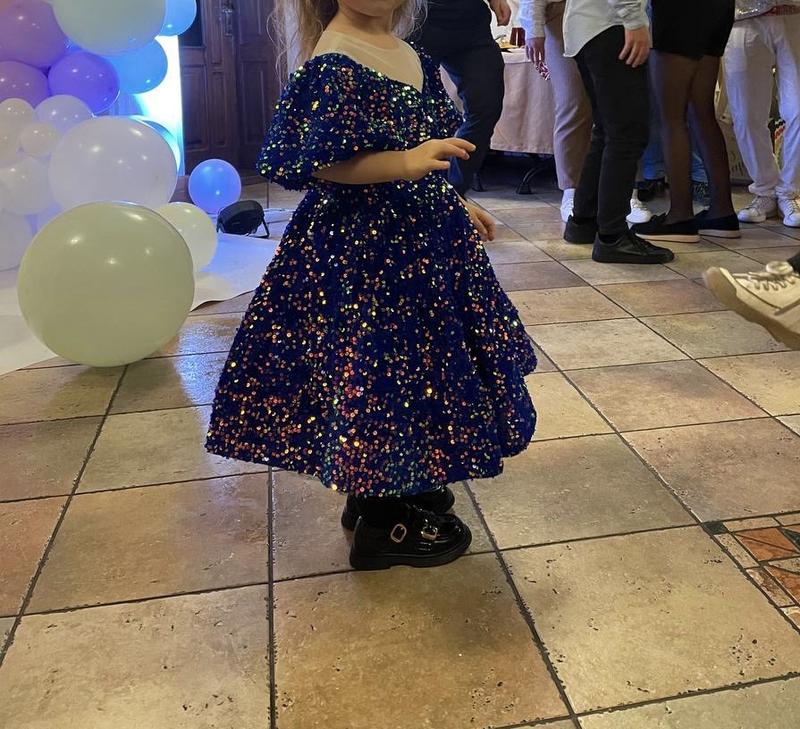 Очень красивое, пышное платье для настоящей принцессы. На рост 110, но одевали на праздник с ростом 102, было ниже икры. На более высокую девочку будет еще лучше.