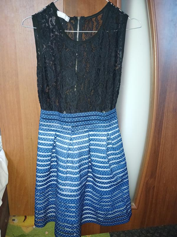 Праздничное платье для девочки, в идеальном состоянии,верх черно- кружево, низ синяя в горошек -резинка, от плеча до низа 81см,ширина в поясе 33см(половина), ширина в плечах 34см. Цена 130грн
