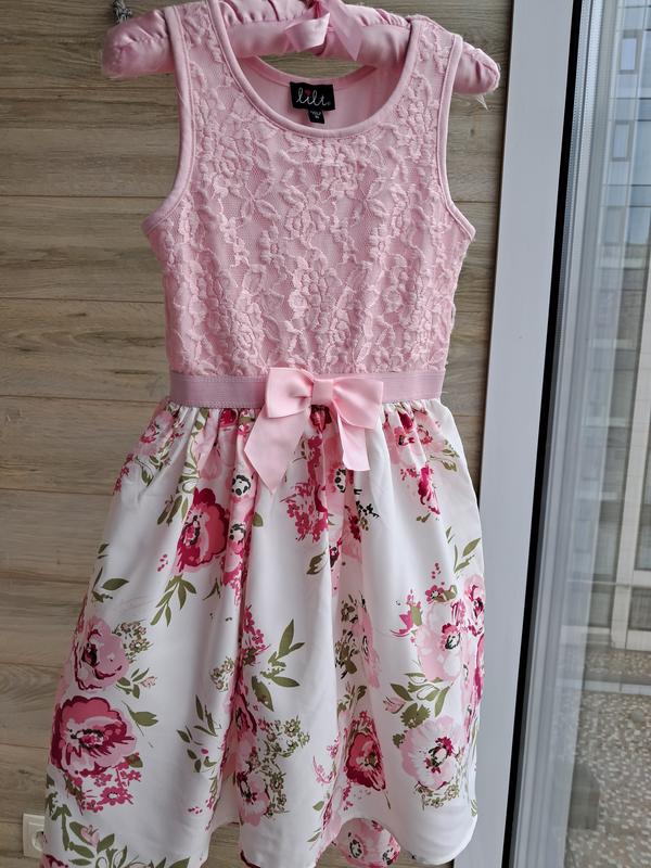 Нарядное платье в цветочный принт на 6л. Сток. Новое.без бирки Замеры: - длина от плеча до низа спереди 66си, сзади длиннее 78см - полуобхват груди 39см, трикотаж, тянется