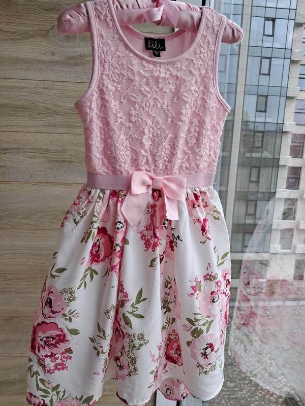 Нарядное платье в цветочный принт на 6-7л. Сток. Новое.без бирки Замеры: - длина от плеча до низа спереди 66си, сзади длиннее 78см - полуобхват груди 39см, трикотаж, тянется