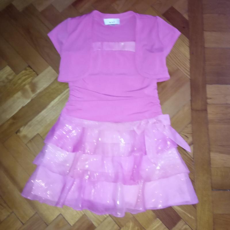 Новая, розового цвета. Длина -58, ширина под подмышками -31+ ткань тянется, балеро не снимается