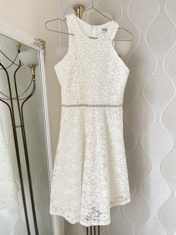 Белое кружевное праздничное платье на брителях длины мини на девочку подростка 16 лет. Стан - идеальный Замеры: Полуобхват в груди 38см Ширина горловини 16см Длина верха 36см Длина юбочки 54см Общая длина 90см