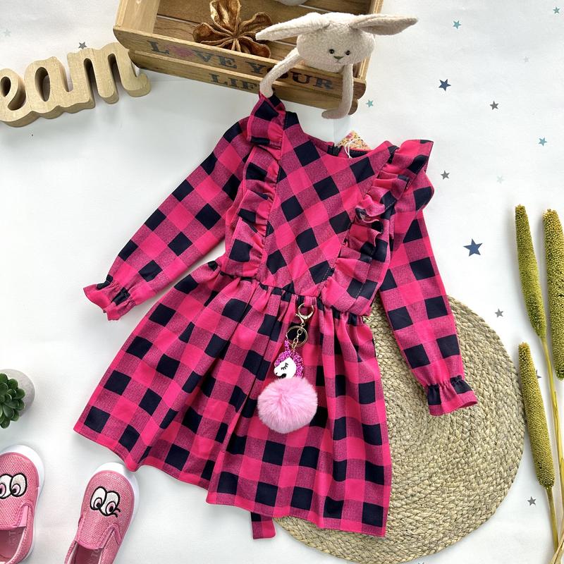 Стильное платье в клетку! Качество- люкс. Невероятно стильная смотрится на девочках! Рукава-присобранные на резинке. Спереду- прикрашено рюшами. Сзади застежка и пояс. Тканина- трикотаж. Размеры: 98 – рукав 34 длина 51 104 -36/54 110 – 38/56 116 – 41/58 122 – 43/61 Цена: 599 грн *Брелок может отличаться от фото.