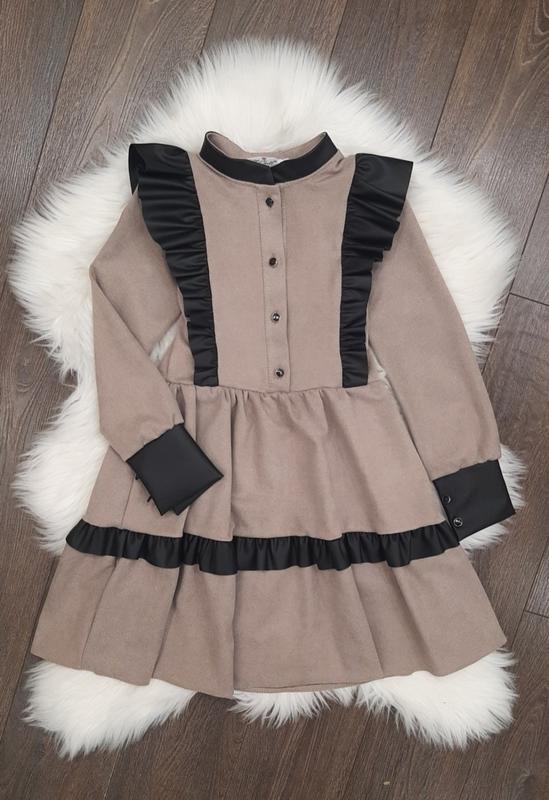 Стильное платье выполненное замшдиагональ в сочетании с эко кожей. Украшена рюшей, кофевчик манжет кожа. замеры: длина/рукав/пог 134-70/51/32 140-75/52/33 146-79/53/34 158-88/57/36 +-2см Аб