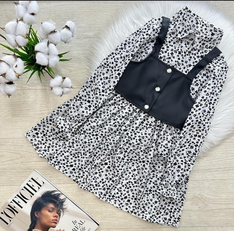 Стильное весеннее платье 🤩❤️🌺 в комплекте с кожаной жилеткой 😍😍😍 Легкое нежное платье 💞в рукавичках резиночка, на грудях ґудзики 🥰 Жилетка на кнопках 👌🏻Комплект невероятно стильный ❤️ Ткань: платье- софт/ жилетка- экокожа на подкладке 🌸 Производитель: Украина 🇺🇦 ЗАМІРИ +/-1-2см!!! ▪️р.158- Платье: длина 82см/рукав от плечевого шва 58см /ПОГ 41см. Жилетка: высота от плеча 34см/ ПОГ37см