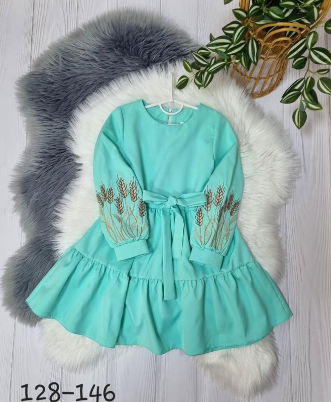 Невероятно красивое и нежное платье На рукавах вышивка ткань костюмка барби по спинке застегивается на молнию, поясок в коплекті 128(2 шт)-длина 69,рукав 45, пог 33 140(2 шт)-длина 74,рукав 50, пог 36 146(2 шт)-длина 76,рукав 52, пог 37 +-2 см