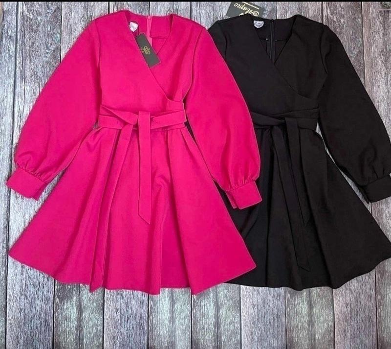 В наявності! Стильна сукня для модниць По спинці до пояса застібається на блискавку. Спереду на запах. Пояск в комплекті. Тканина- костюмна. Заміри: 140 довжина - 69см, рукав від плеча - 52см, напівобхват грудей - 38см 146 довжина - 75см, рукав від плеча - 54см, напівобхват грудей - 39см 152 довжина - 79см, рукав від плеча - 57см, напівобхват грудей - 41см 158 довжина - 83см, рукав від плеча - 58см, напівобхват грудей - 44см 164 довжина - 87см, рукав від плеча - 63см, напівобхват грудей - 45см Розміри в наявності: ЧОРНИЙ: 140-4шт 146-1шт 152-1шт 158-продано 164-продано МАЛИНА: 140-1шт 146-1шт 152-1шт 158-продано 164-4шт Арт мод