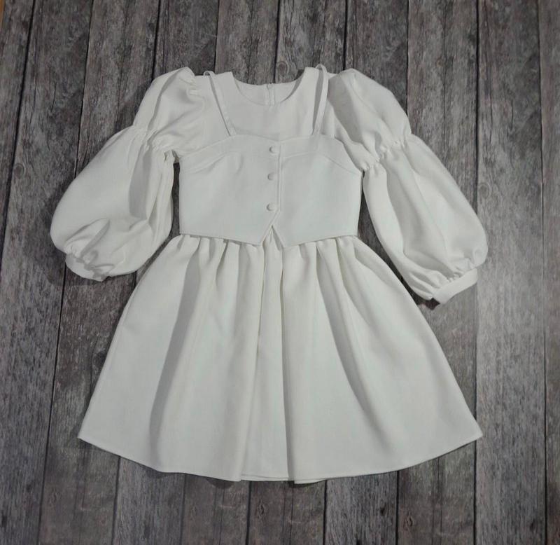 Стильна сукня для модниць По спинці до пояса застібається на блискавку. Тканина- костюмна, топ - екошкіра. Колір сукні- МОЛОЧНИЙ. Заміри: 140 довжина - 72см, рукав від горловини - 55см, напівобхват грудей - 34см 146 довжина - 76см, рукав від горловини - 59см, напівобхват грудей - 37см 152 довжина - 82см, рукав від горловини - 64см, напівобхват грудей - 39см 158 довжина - 86см, рукав від горловини - 66см, напівобхват грудей - 41см Розміри в наявності: 140-1шт 146-1шт 152-1шт 158-1шт Арт мод