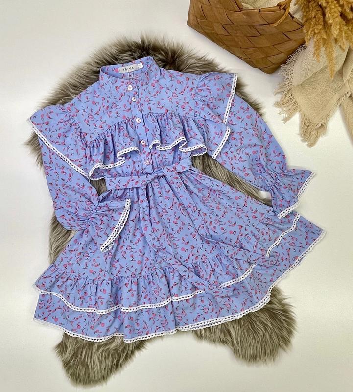 арт 4544 НОВИНКА! Весняно-літня сукня з тканини софт прикрашена грайливими воланами обшиті бавовняним мереживом в талії та рукава під резиночку поясок у комплекті РЕКОМЕНДУЮ! зріст/довж./пог/рукав від горловини похибка +-2см 128/70/35/54-2шт 134/72/36/57-2шт 140/75/37/60-2шт 146/77/39/63-2шт 152/79/42/65-2шт