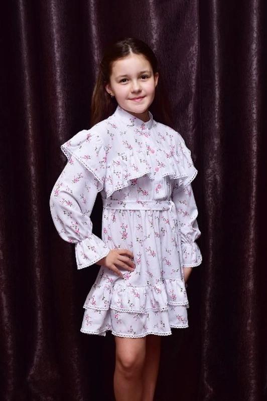 Весняно-літня сукня з тканини софт прикрашена грайливими воланами обшиті бавовняним мереживом в талії та рукава під резиночку поясок у комплекті зріст/довж./пог/рукав від горловини 128/70/35/54 134/72/36/57 140/75/37/60 146/77/39/63 152/79/42/65