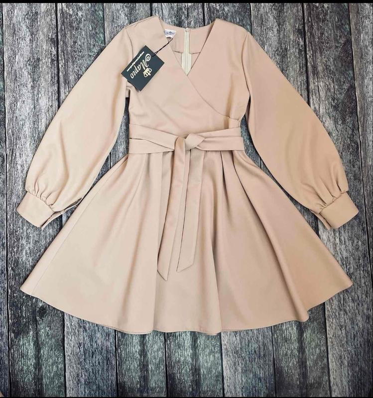 Стильное платье для модниц По спинке к поясу застегивается на молнию. Спереду на запах. Пояс в комплекте. Тканина- костюмна. Замеры: 140 длина - 69см, рукав от плеча - 52см, полуобхват груди - 38см Мс