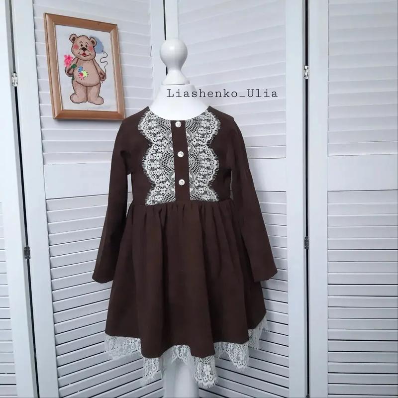 Сукня зшита із мікровельвета шоколадного кольору із мкреживом молочного кольору . Підкладка - 100 % бавовна . Застібається сзаду на блискавку .