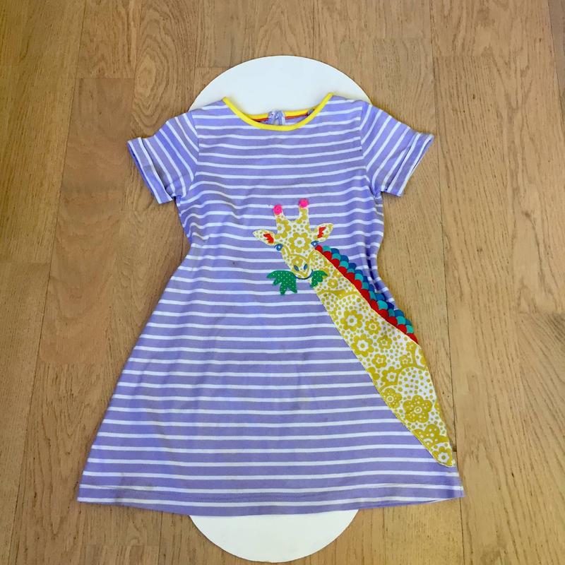 Трикотажное платье Mini Boden. Свободного кроя, трапеция. В полоску, декорировано аппликацией жирафа. Размер указан 5-6 лет, 116 см. 100% бавовна. Замеры: плечи 25,5 см грудь 31,5 см длина 56 см. Нюанс- есть пятна( фото 8-10). Для дачи, для дома.