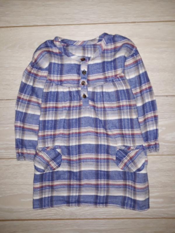 Фірмова сукня для дівчинки на 2-3 роки. Попереду застібається на ґудзички. Склад 100% бавовна. Стан відмінний Виміри: довжина по спинці від плеча 50 см, ширина між пахвами 35 см, рукав від плеча 28,5 см, по внутрішньому шву 23,5 см, плече 9,5 см